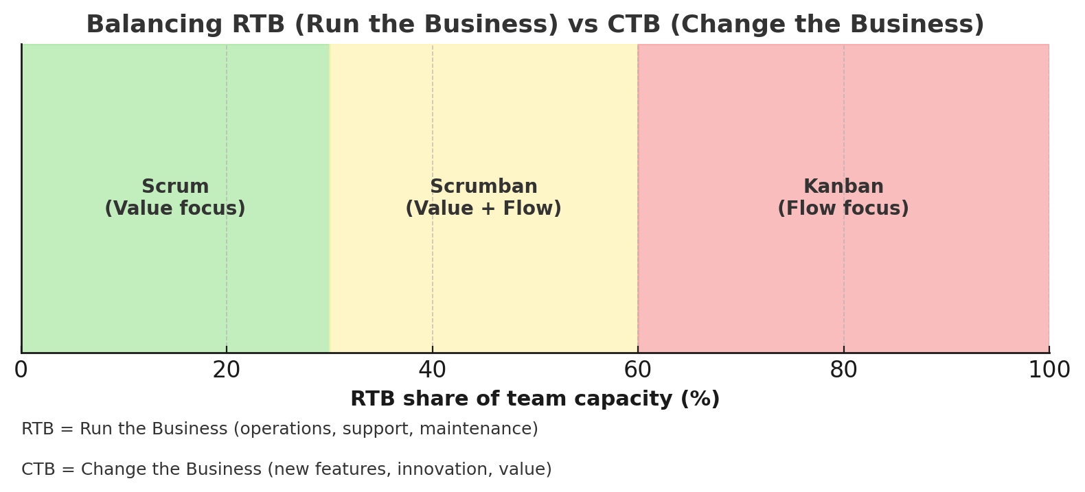 - If RTB is somewhere between 30% and 60%, you're in hybrid territory. You still want to preserve Scrum's focus on delivering increments of value, but you need to explicitly carve out capacity for RTB and manage the flow of this work with Kanban-style practices (e.g., limiting the work-in-progress, visualizing the pipeline).
