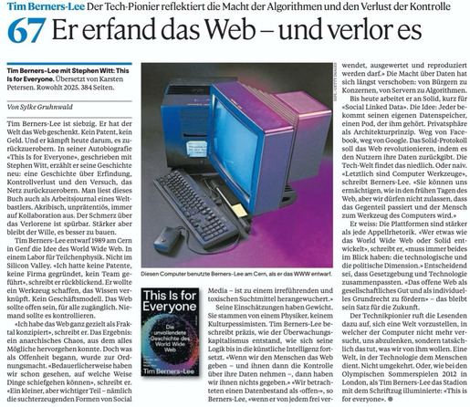 #Mastodon (source: @Sylke Gruhnwald)Tim Berners-Lee erfand das Web – und kämpft heute darum, es zurückzuerobern. Meine Buchkritik zu «This Is for Everyone» in der NZZ am Sonntag: https://www.nzz.ch/feuilleton/er-erfand-das-web-und-verlor-es-ld.1914136Und dazu das Portrait über Tim Berners-Lee im New Yorker: https://www.newyorker.com/magazine/2025/10/06/tim-berners-lee-invented-the-world-wide-web-now-he-wants-to-save-it