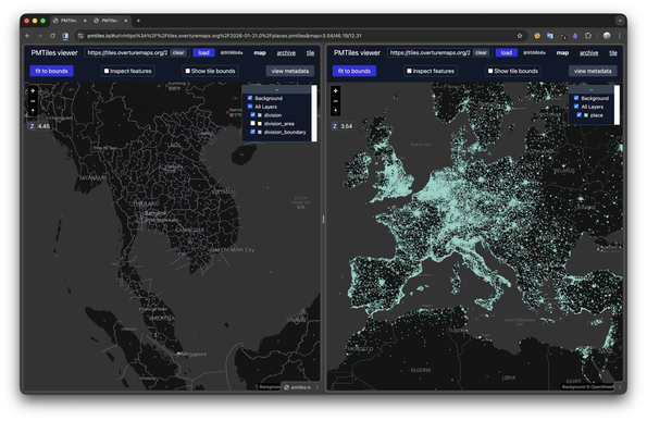 #Mastodon (source: @Dominik Weckmüller)@overturemaps now offers a STAC catalogue with all their datasets and it's super convenient to use! The best part: every dataset is now also released as pmtiles file you can query on the spot in your browser!Browser: https://radiantearth.github.io/stac-browser/#/external/stac.overturemaps.org/2026-01-21.0/catalog.json?.language=enPmtiles example: https://pmtiles.io/#url=https%3A%2F%2Ftiles.overturemaps.org%2F2026-01-21.0%2Fplaces.pmtiles&map=0.8/0/0