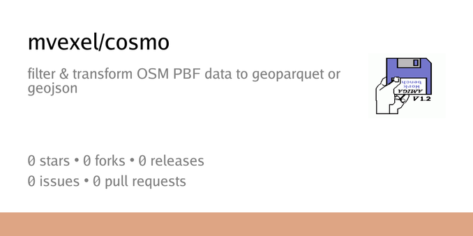 #Mastodon (source: @Martijn van Exel)cleaning up some personal projects I worked on in the past months and won't have much time for when my new job starts (Monday): **cosmo** - a fast command line tool for converting #OSM data into GeoJSON(seq) or parquet.Another one of those you say? Sure, but this one takes the best of some of the existing tools and combines them into one:1. speed 2. scale (entire planet with ease on a 16GB laptop)3. really good data filtering and transformation using YAML.https://codeberg.org/mvexel/cosmo